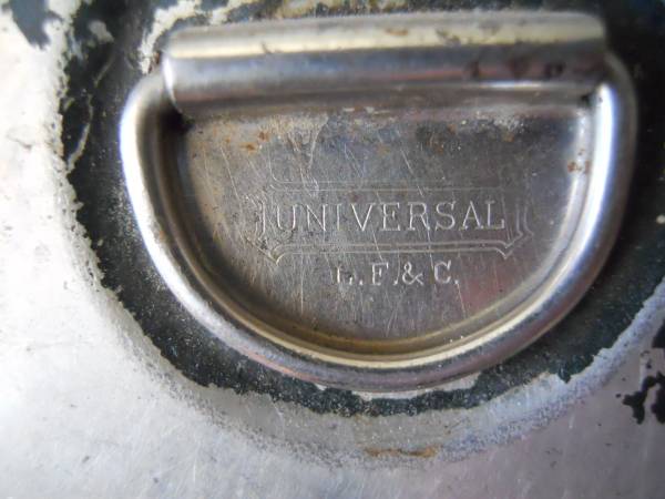 1913 Universal L. F. & C. (Landers Frary and Clark) Slide Out Lunch Box. Model 550198. Very Old Leather handle strap, may not be original. No Thermos, but there is cubby Space for one. Great Patina (rust on bottom). $40 . Please call show contact info