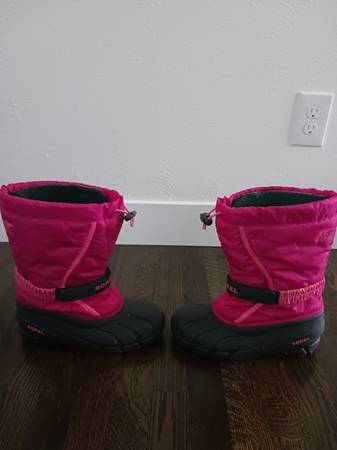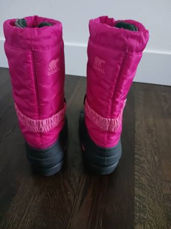 SOREL YOUTH FLURRY SNOW BOOTS: Big Kids size 6. Deep Blush, Tropic Pink color. New condition as I purchased these in April of this year but my child went to try them on this morning and they are too small. These are the only type of snow boots that I buy because they have adjustments at the ankle area and the top of the boots so they don't flop around or get snow down in them plus these have thick removeable felt liners. Kid's feet stay warm and dry and liners remove so boots dry quickly and liners can be washed if needed. The boots measure 11.5" high. Pet free, smoke free, perfume free home. Retail was $70. Asking $25. CASH ONLY.