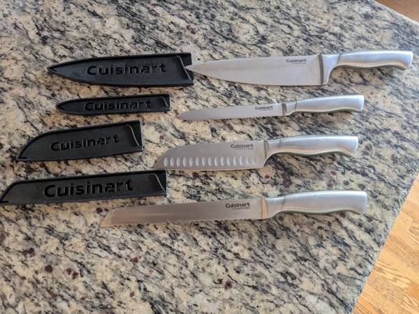 Very rarely used Cuisinart knife set. 8" Chef Knife 5.5" Serrated Utility Knife 3.5" Paring Knife 7" Santoku Knife Each has a matching blade guard for safe storage.